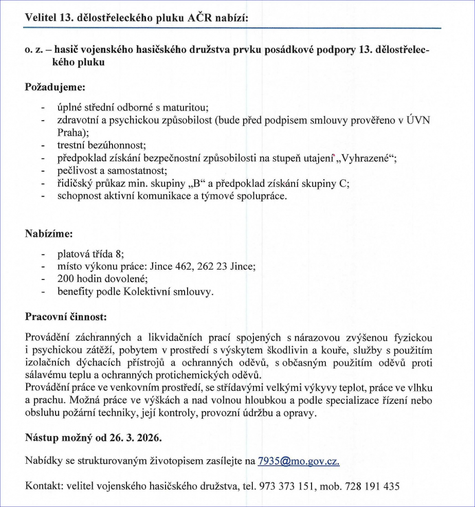 5.2.2026 Štefan Roško Hasiči vojenského útvaru 7935 Jince hledají do svého týmu novou posilu - civilního zaměstnance - Hasič vojenského hasičského družstva. Požadavky viz. níže. Požadavky